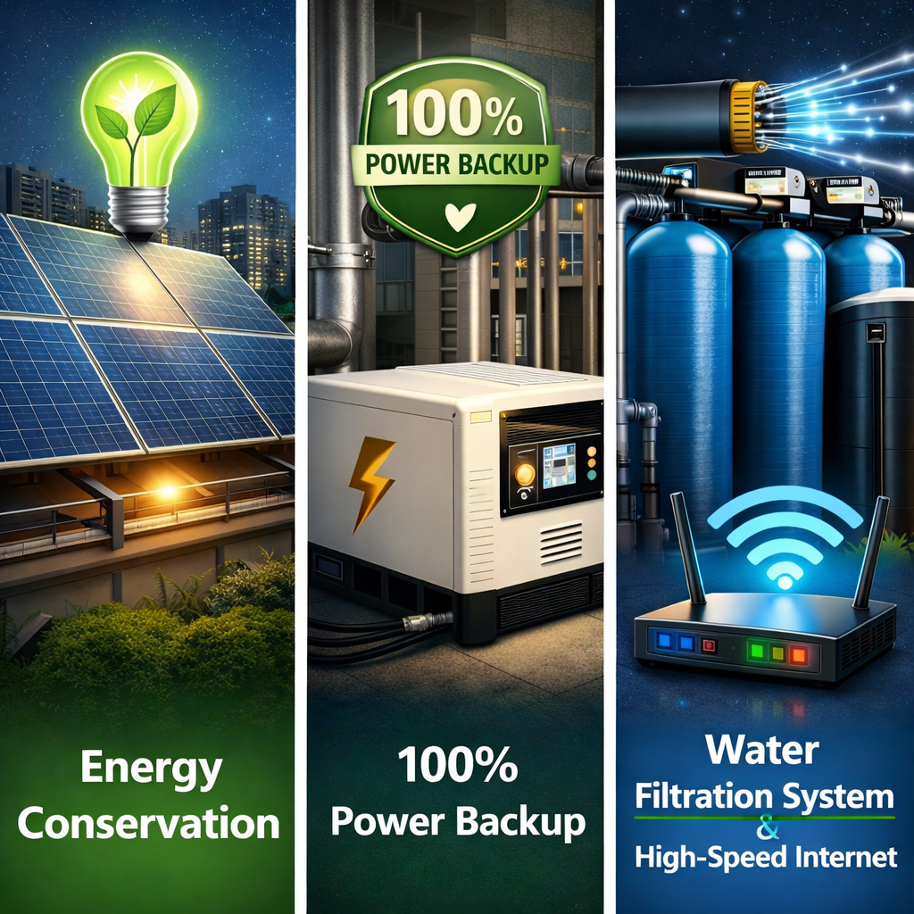 Energy conservation, 100% power backup, water filtration systems, and high-speed digital connectivity indicate a future-ready approach. LED-lit facades not only add aesthetic value but also redefine the city skyline with sustainable lighting design.